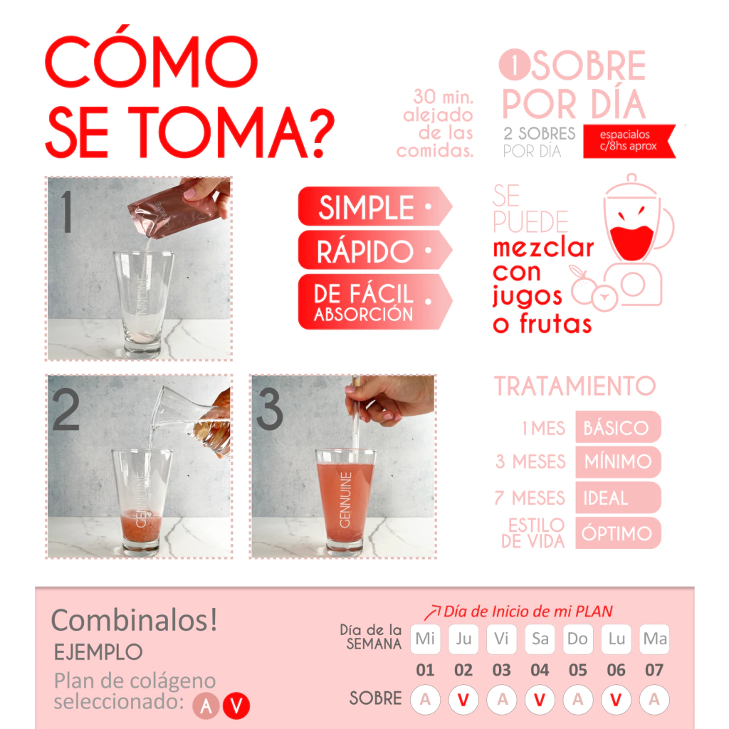 Fórmula: Colágeno hidrolizado 10 gramos diarios + 4 activos: Mucopolisacáridos de Origen Marino (Ácido Hialurónico Natural) 100 mg diarios, Vitamina E 10 mg diarios, Luteína 10 mg diarios y Vitamina C 45 mg diarios.