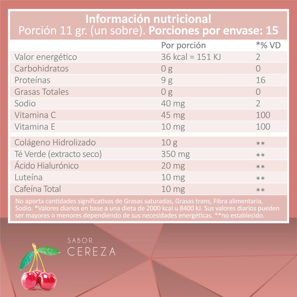 Fórmula: Colágeno hidrolizado 10 gramos diarios + 4 activos: Ácido Hialurónico 20 mg diarios, Té Verde 350 mg, Vitamina E 10 mg diarios, Luteína 10 mg diarios y Vitamina C 45 mg diarios.