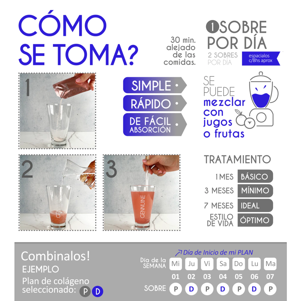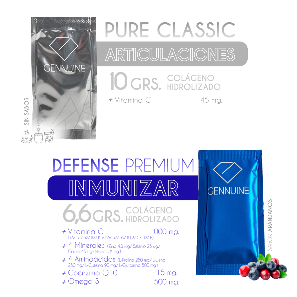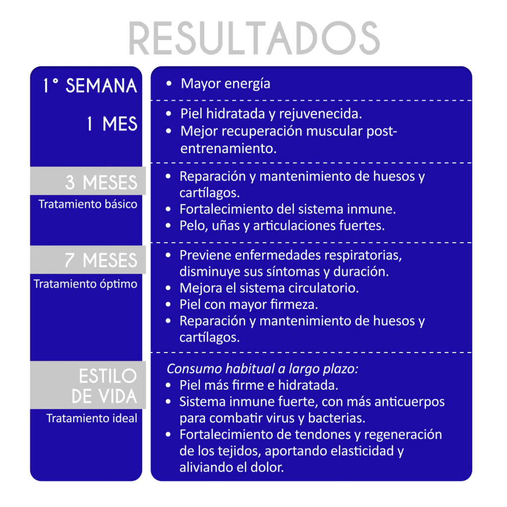 Fórmula: Colágeno hidrolizado 10 gramos diarios, Vitamina C 45 mg diarios.