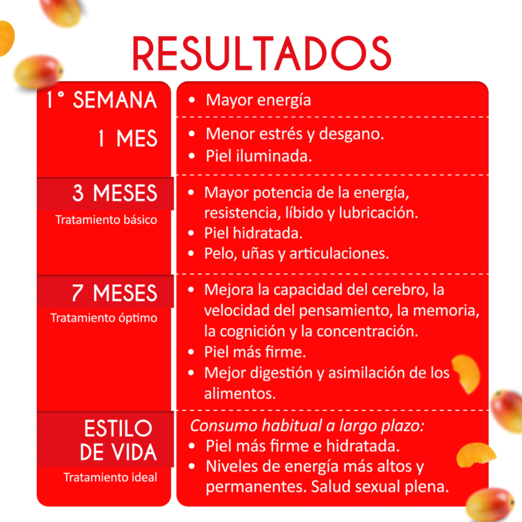 Fórmula: Colágeno hidrolizado 10 gramos diarios + 6 activos: Ginseng 240mg, L-Arginina 100mg, Gingko Biloba 120mg, Damiana 50mg, Guaraná 400mg y Vitamina C 500mg.